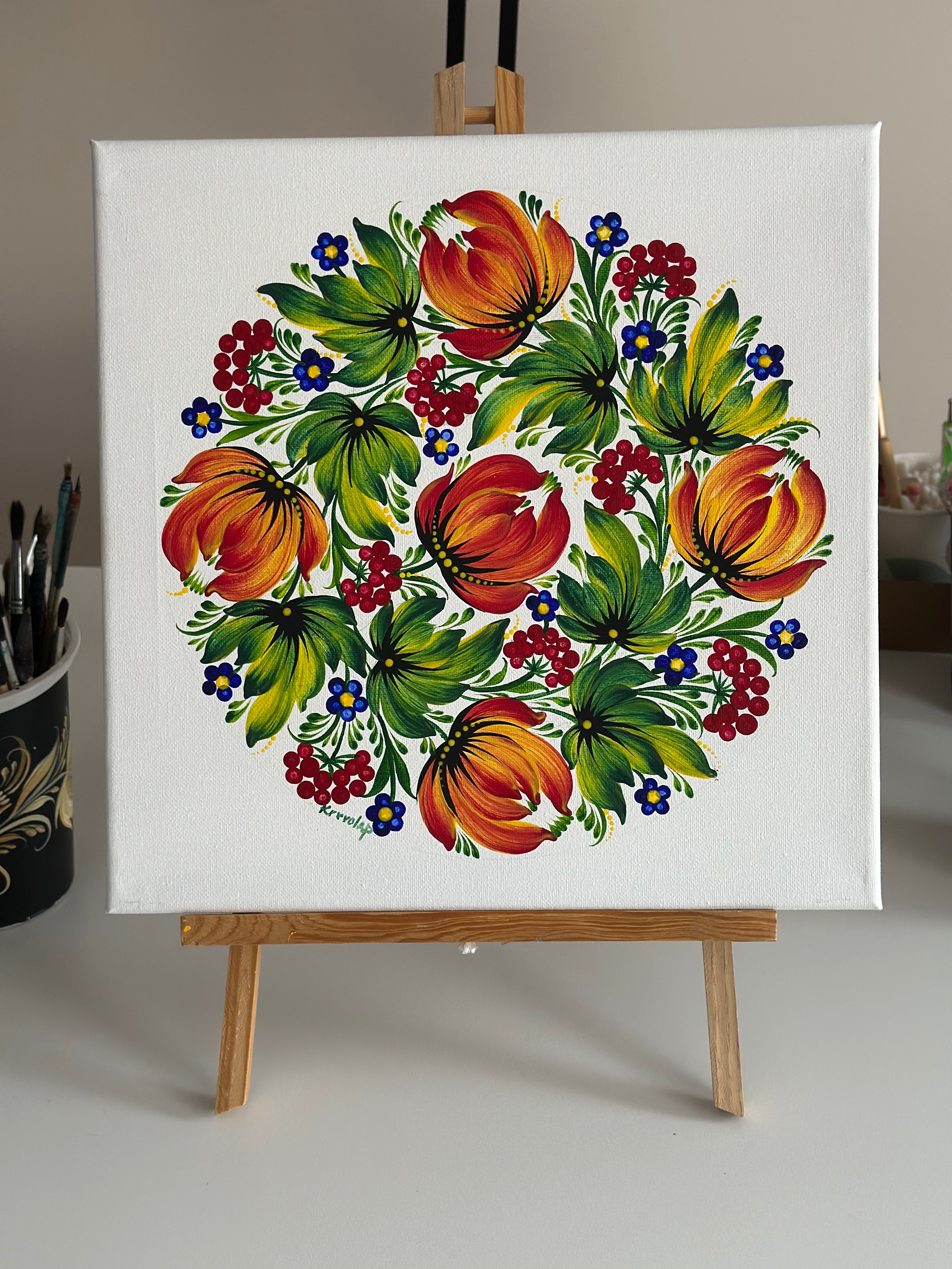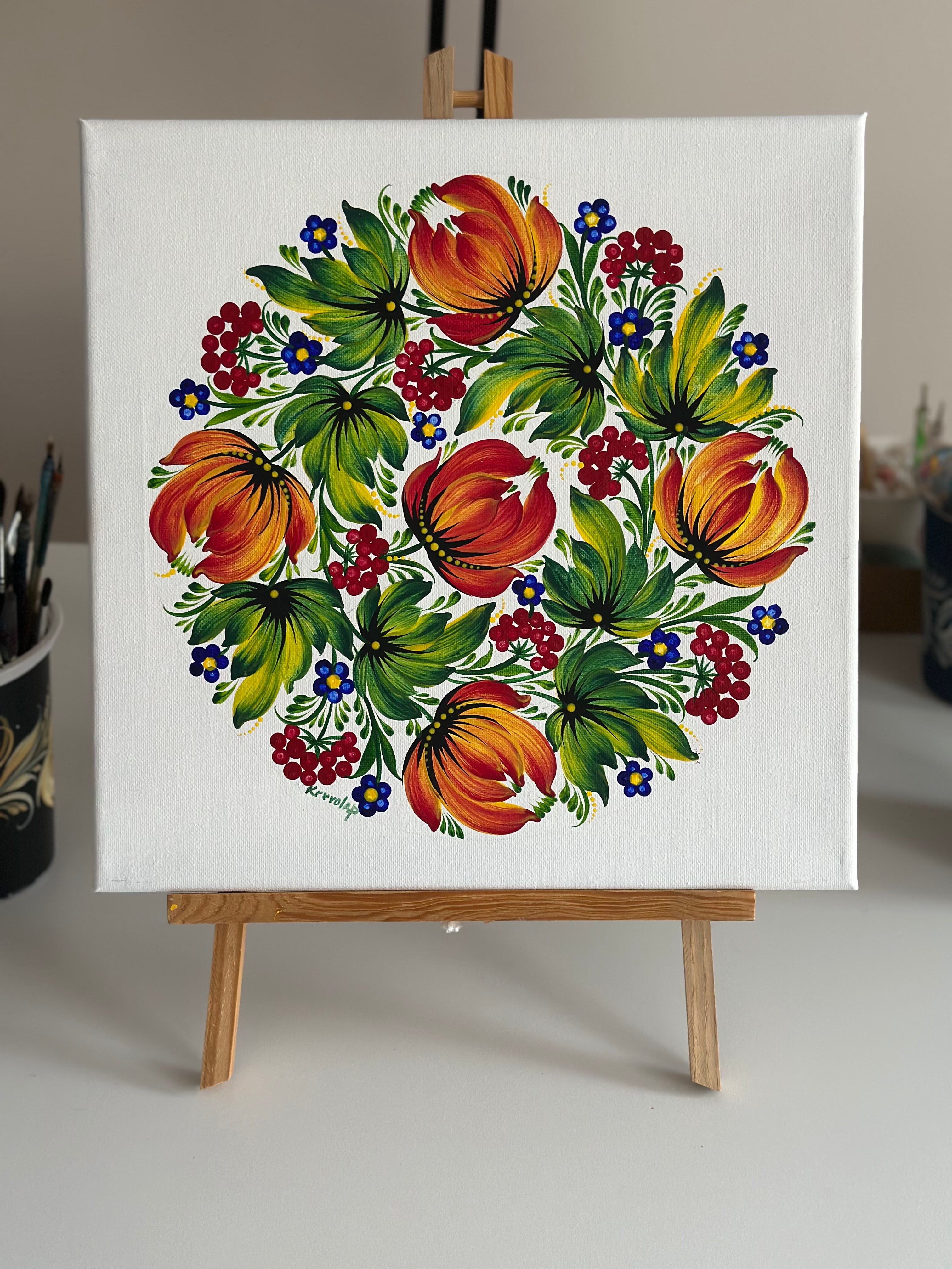 Style: Traditional Ukrainian decorative painting style Petrykivka