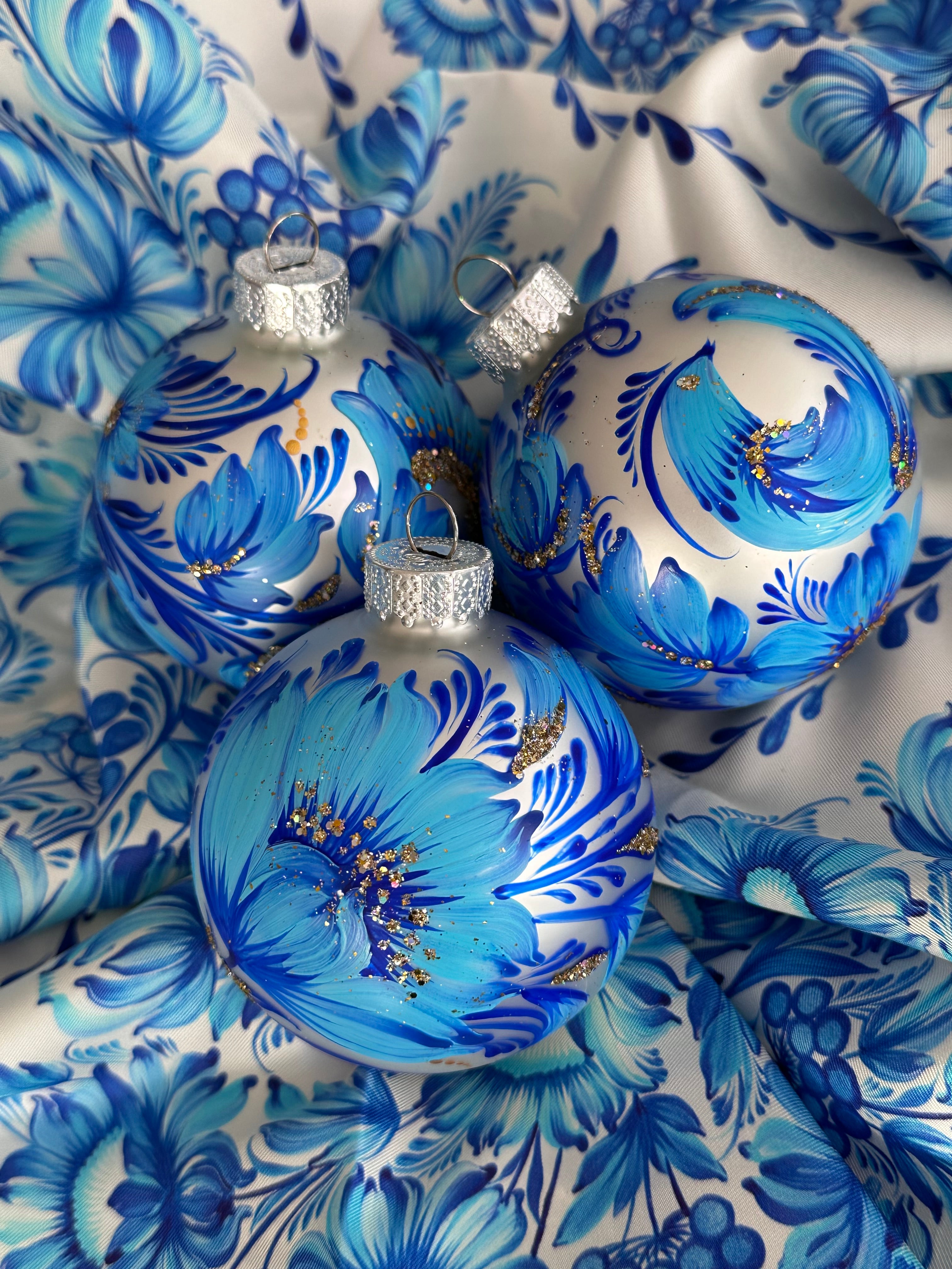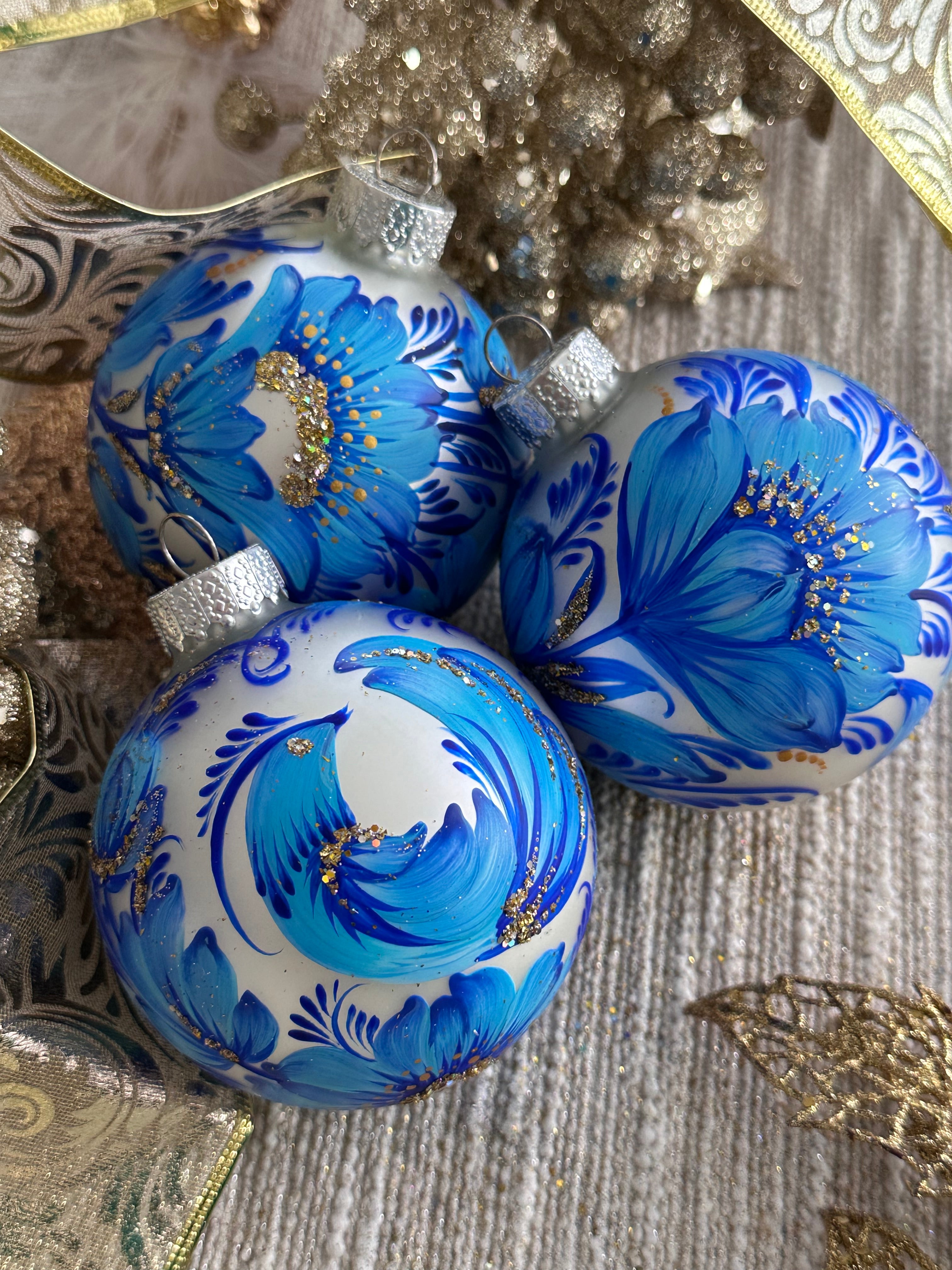 One-of-a-kind set of 3 ornaments, 100% hand-painted by Kateryna Kryvolap.