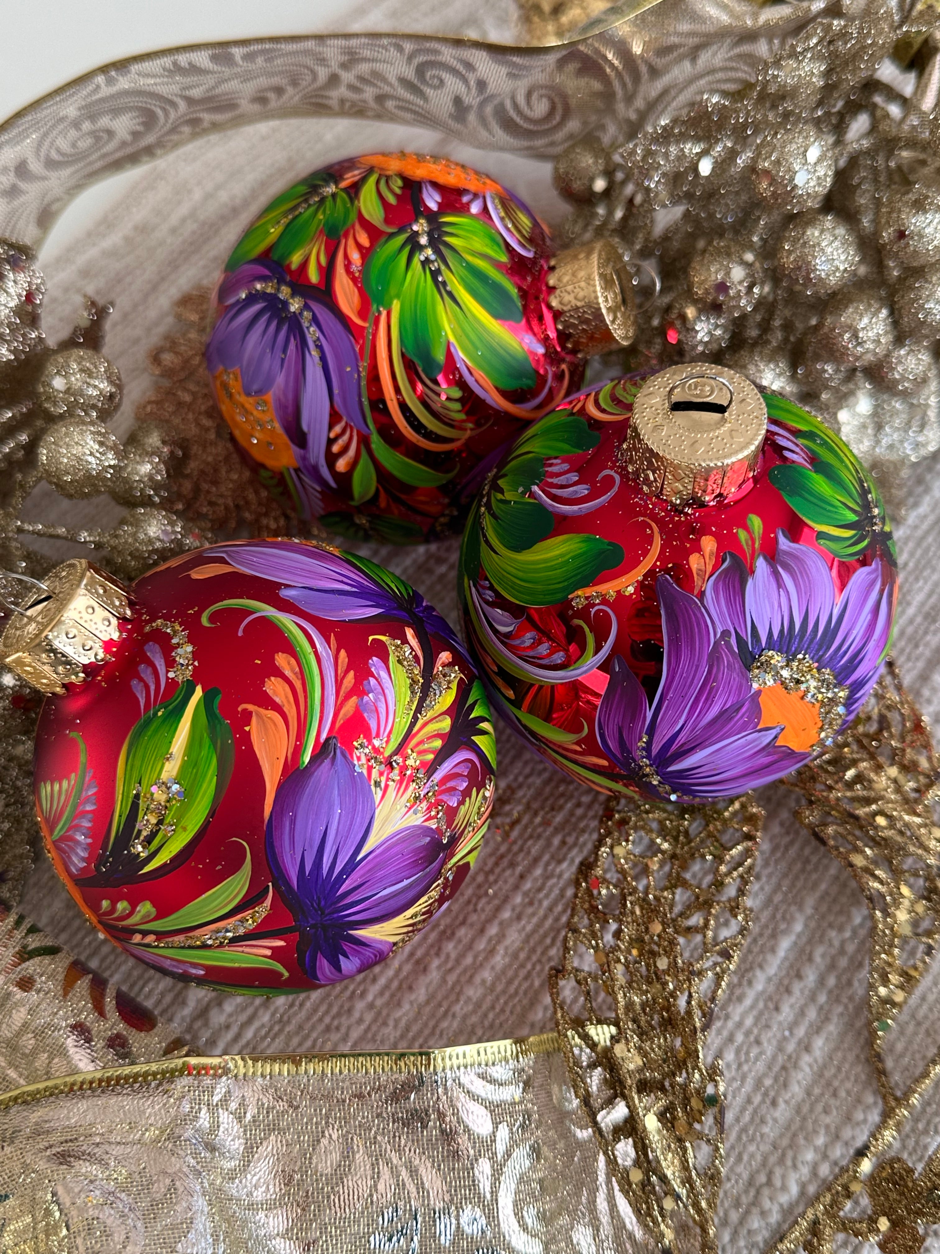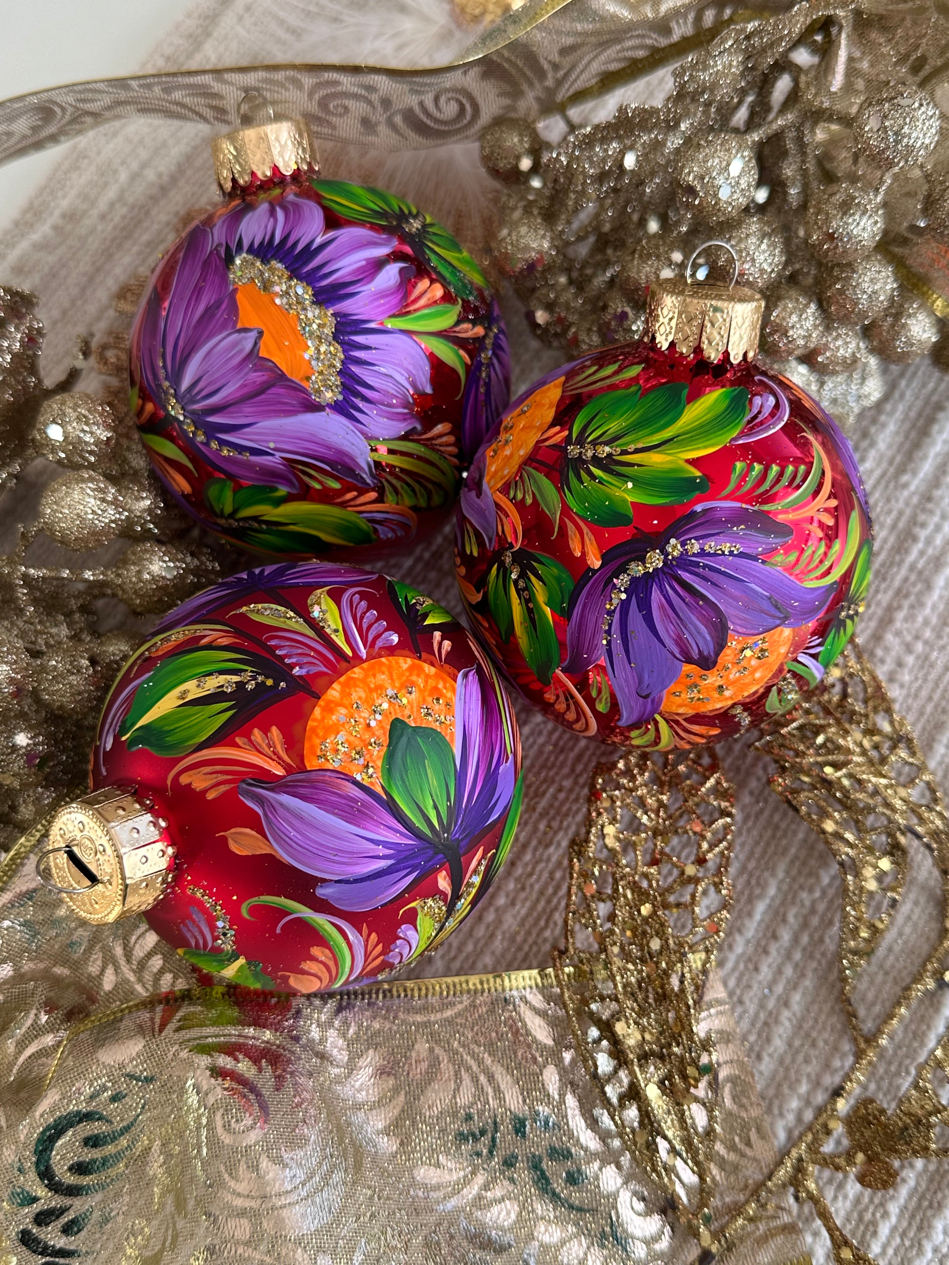 One-of-a-kind set of 3 ornaments, 100% hand-painted by Kateryna Kryvolap.